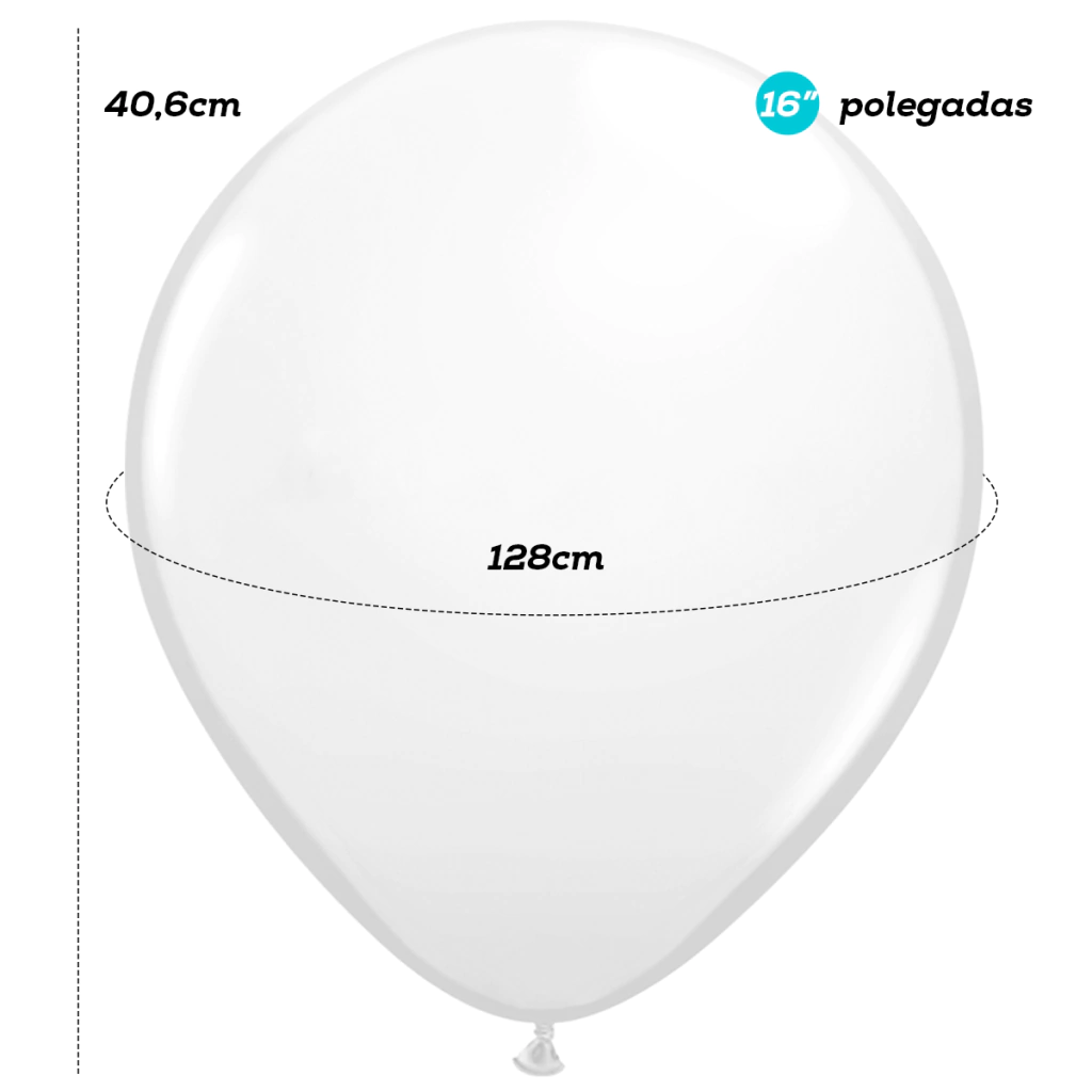 Cada balão de látex tem seu tamanho descrito em polegadas.